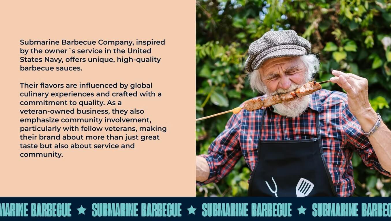 Submarine Barbecue Company, inspired by the owner's service in the United States Navy, offers unique, high-quality barbecue sauces. Their flavors are influenced by global culinary experiences and crafted with a commitment to quality. As a veteran-owned business, they also emphasize community involvement, particularly with fellow veterans, making their brand about more than just great taste but also about service and community.