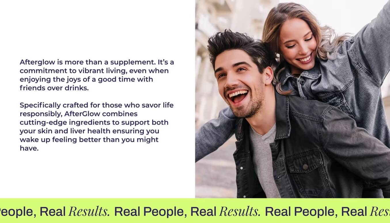 Afterglow is more than a supplement. It's a commitment to vibrant living, even when enjoying the joys of a good time with friends over drinks. Specifically crafted for those who savor life responsibly, AfterGlow combines cutting-edge ingredients to support both your skin and liver health ensuring you wake up feeling better than you might have.