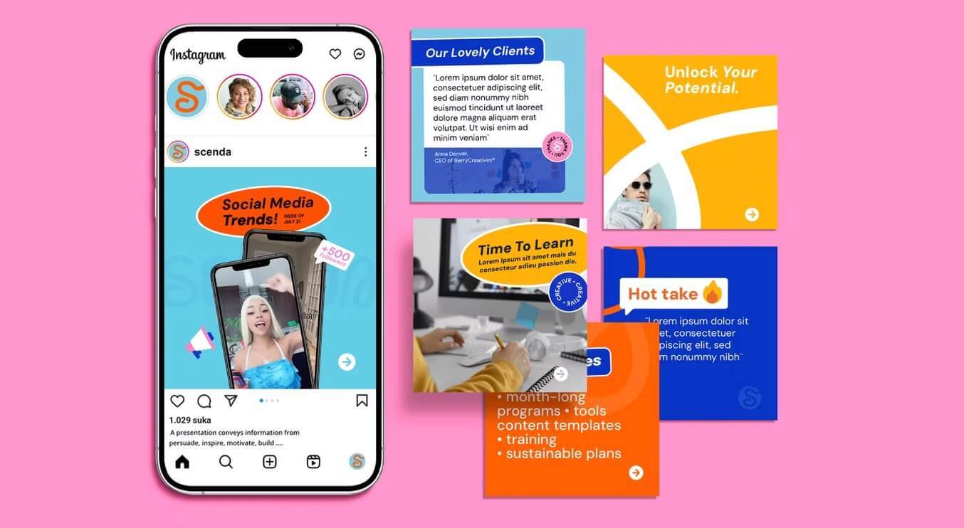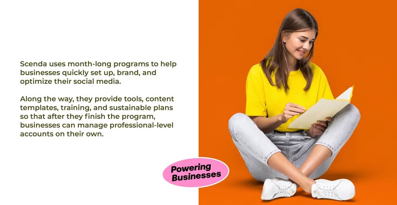 Scenda uses month-long programs to help businesses quickly set up, brand, and optimize their social media. Along the way, they provide tools, content templates, training, and sustainable plans so that after they finish the program, businesses can manage professional-level accounts on their own.