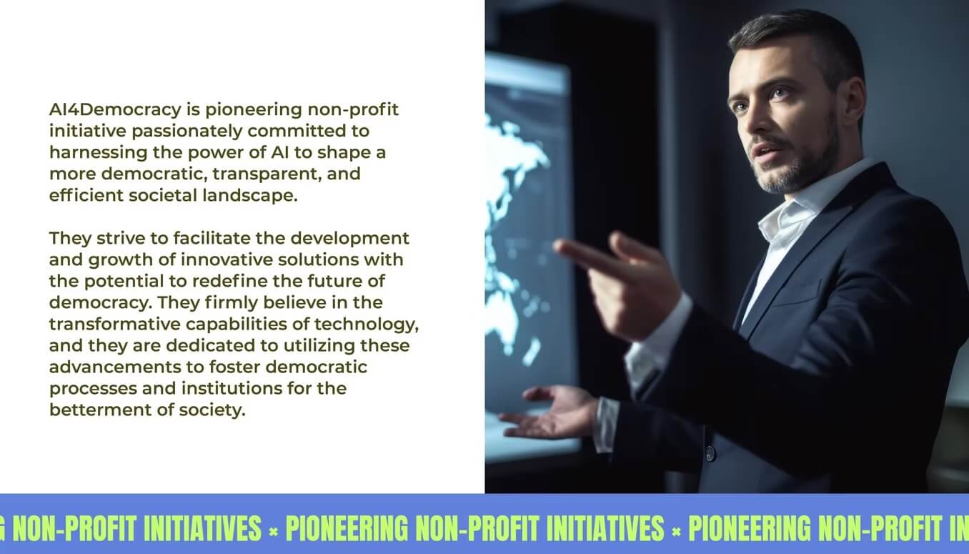 Al4Democracy is pioneering non-profit initiative passionately committed to harnessing the power of Al to shape a more democratic, transparent, and efficient societal landscape. They strive to facilitate the development and growth of innovative solutions with the potential to redefine the future of democracy. They firmly believe in the transformative capabilities of technology, and they are dedicated to utilizing these advancements to foster democratic processes and institutions for the betterment of society.